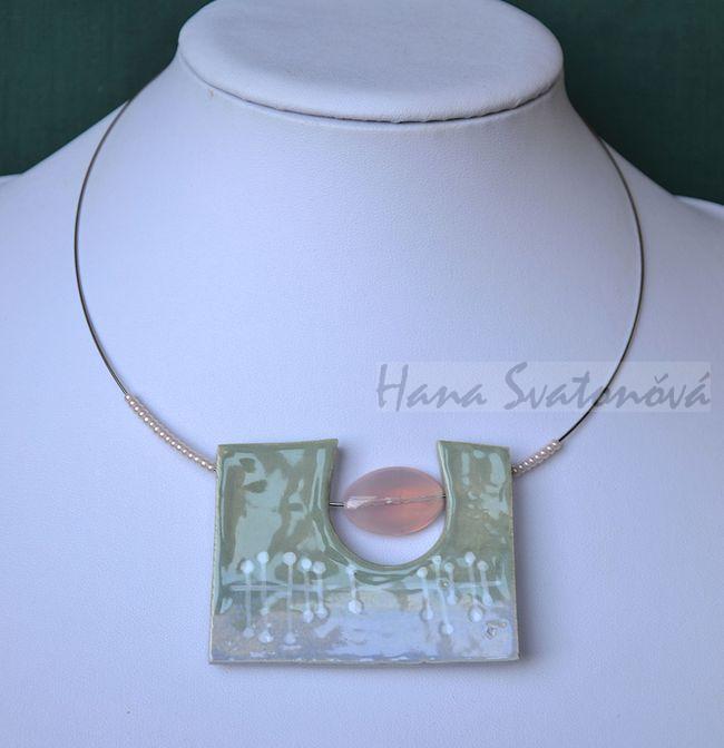 Keramický ručně malovaný náhrdelník zdobený korálky.